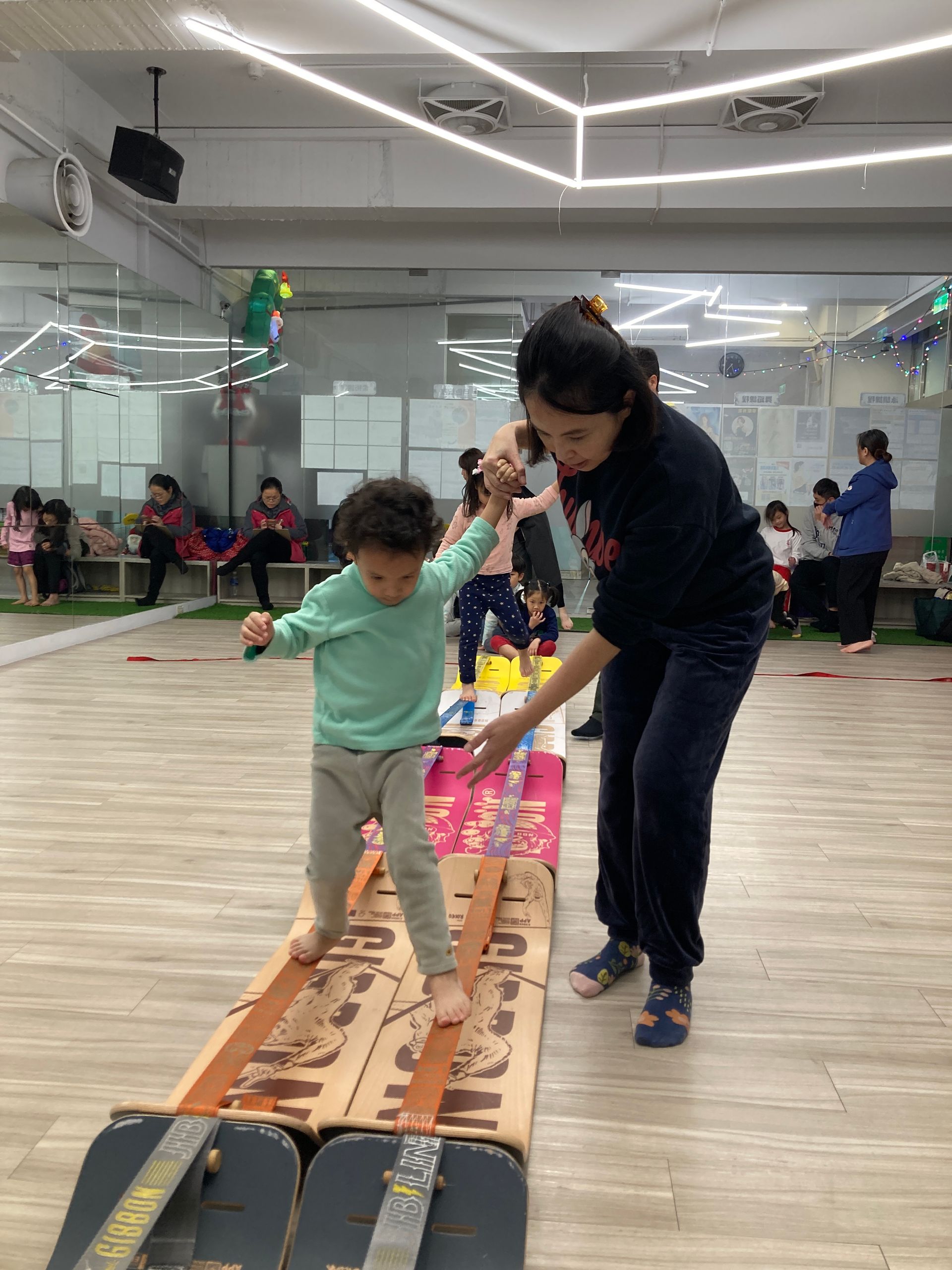 - 家長扶著孩子一起保持平衡